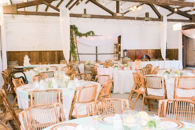 Our wedding venue's reception barn features stunning chandeliers, rustic beams & holds 100-120 comfortably, with overflow seating available on our patio & lawn.